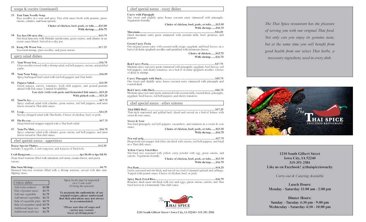 Welcome to Thai Spice, a hidden gem in the heart of Iowa City that promises an authentic Thai culinary experience. Nestled at 1210 S Gilbert St #200, this quaint restaurant is much more than just a place to eat; it’s a celebration of vibrant flavors and warm hospitality.