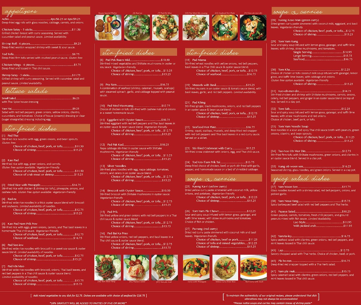 The menu at Thai Spice boasts a diverse selection of dishes that cater to both traditional Thai enthusiasts and newcomers alike. For those starting their meal with something fresh and zesty, the Yam Yai lettuce salad provides a refreshing kick, while the Yam Woon Sen and Papaya Salad showcase the restaurant's expertise in balancing sweet, sour, and spicy flavors.