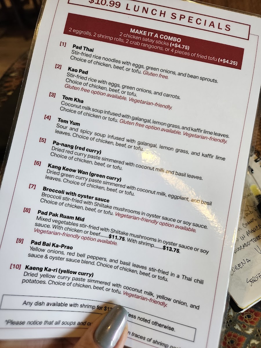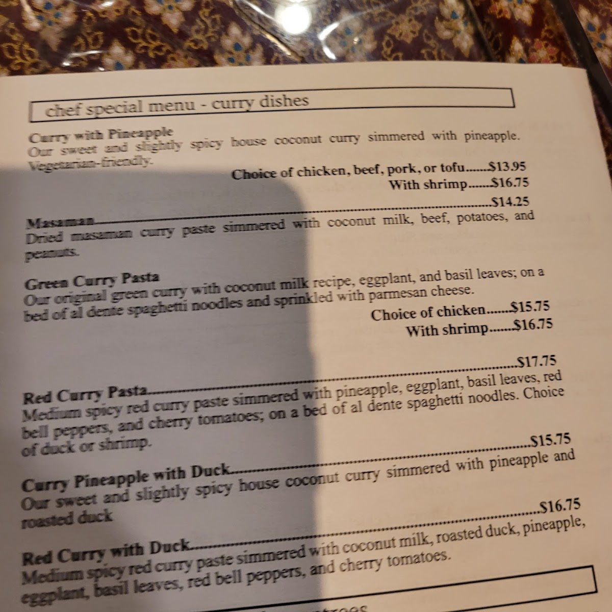 Moving on to the chef's special offerings, prepare your taste buds for delightful creations such as the Green Curry Pasta with Shrimp, which merges iconic Thai spices with a comforting pasta twist. A local favorite, the Pad See Ew, is a must-try; it’s made with handmade noodles that truly elevate the dish, reflecting the commitment to quality ingredients that keep patrons coming back for more.
